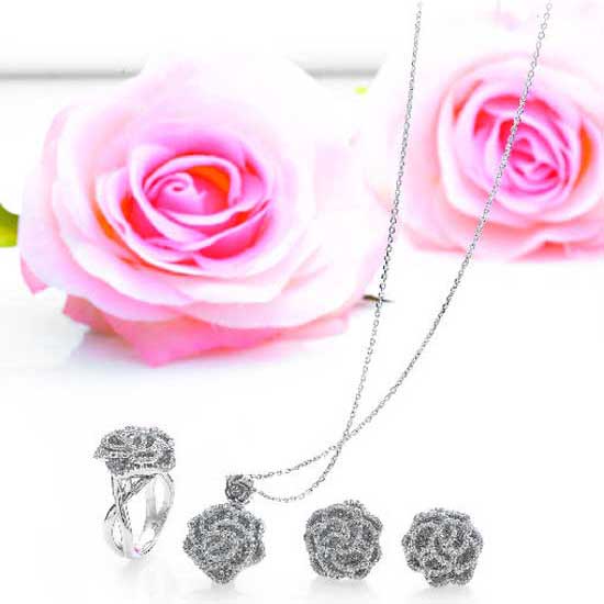 This is a jewelry set that comes in flower shapes. Set on sterling silver, the set includes a ring, a necklace and a pair of earrings. This beautiful flower jewelry set is embellished with sparkling CZ stones for an elegant touch.