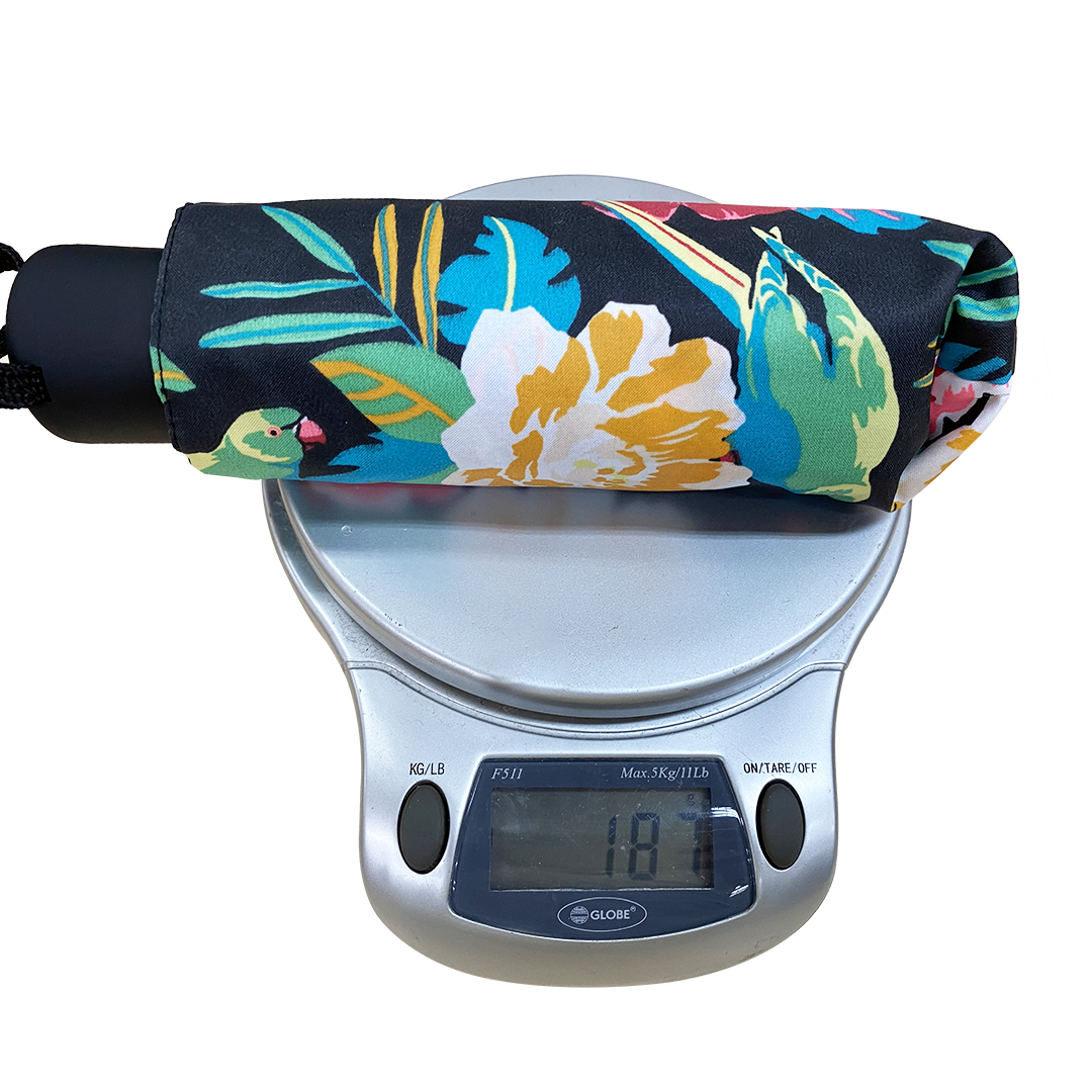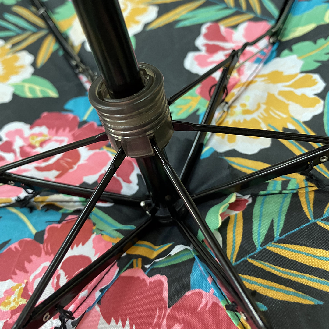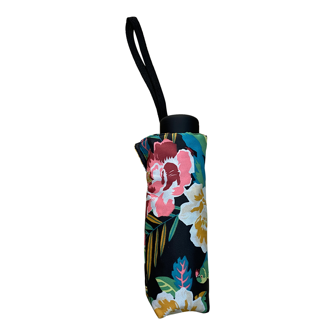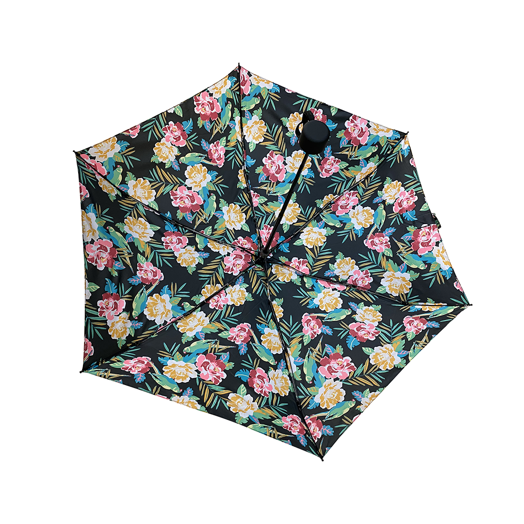 Designer compact umbrella for women crafted with flower print canopy and a black handle.