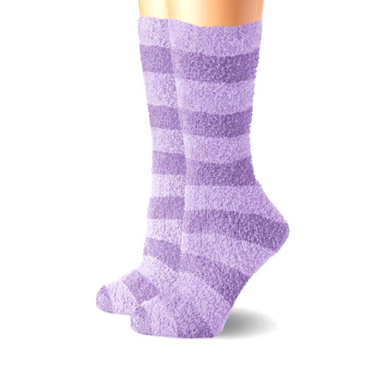 This is a pair of fluffy socks that is soft and comfortable to the touch. This two-toned striped patterns accent this pair of socks. This pair of socks is an ideal choice for travel use.