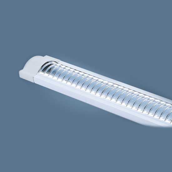 This fluorescent lamp is designed with a single tube light. A row of curved reflectors is added to create an evenly distributed lighting effect. This practical and well designed lamp is ideal for offices and other commercial premises.