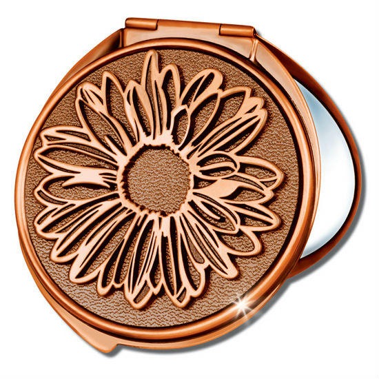 This copper-plated mirror flaunts a embossed chrysanthemum pattern on top, lending the overall round compact craft a delicate vintage note. The foldable design further features a normal and a magnifying mirror for daily cosmetic touch-up.