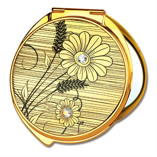 Check your makeup on the go with this pocket mirror kept in your handbag. It boasts luxurious glamor with a glossy, golden finish, and stone-adorned daisy embellishments on the case. The compact comes with a standard mirror for normal reflection and a magnifying mirror to capture finer details.