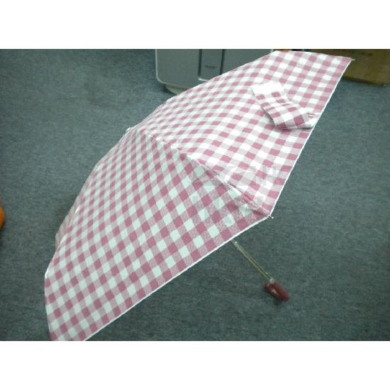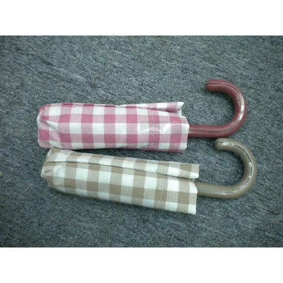 This umbrella is adorned with plaid patterns on the canopy and comes with a matching pouch for storage. It has a plastic handle in a crooked design and has a durable metal shaft with fiber glass ribs. The umbrella provides effective shelter against the rain and is easy to store in your bags or backpacks.