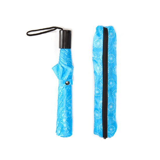This is a 2-section folding umbrella with a trendy design. It features a blue canopy with exquisite white patterns. This umbrella comes with a strap on the handle and a matching bag.