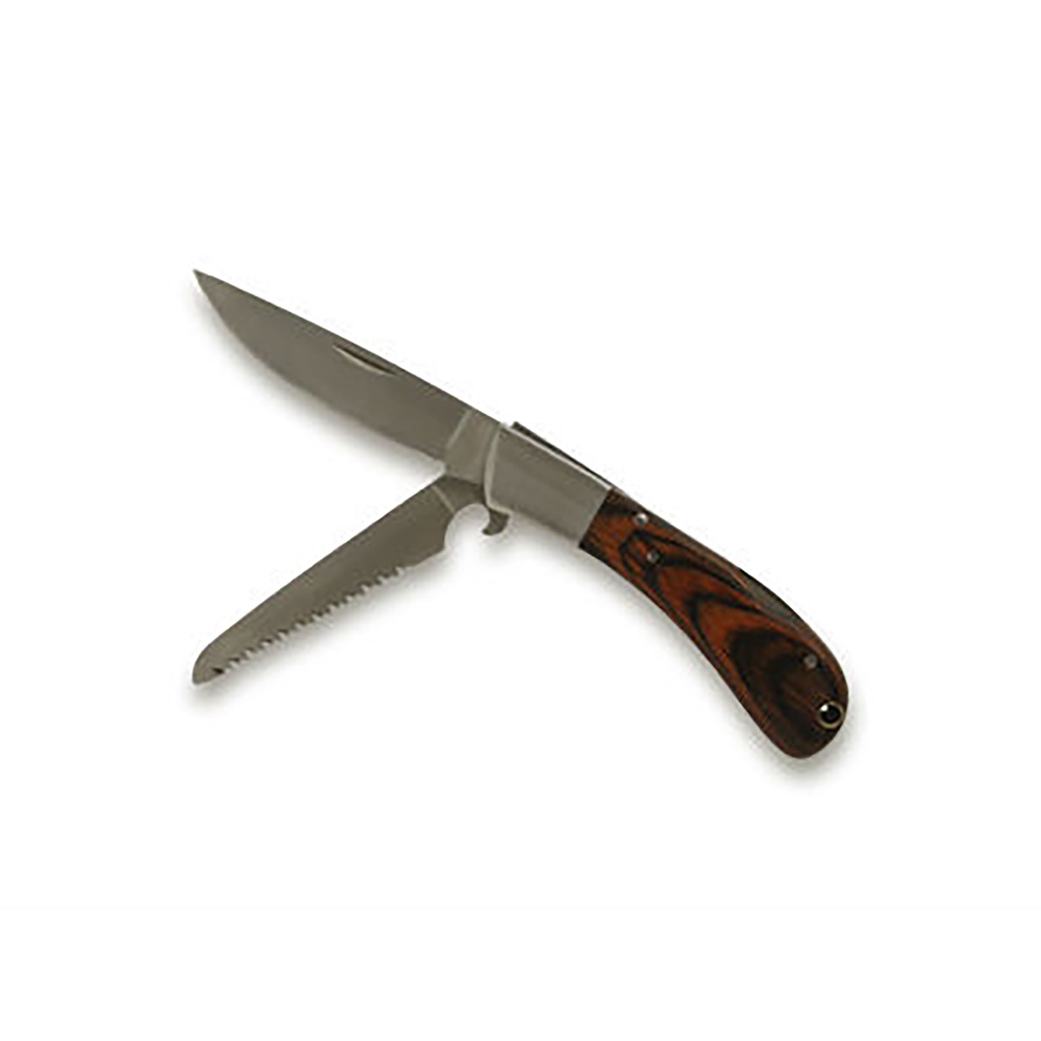 Wooden folding knife with wood saw (lock-back style) includes the following features: