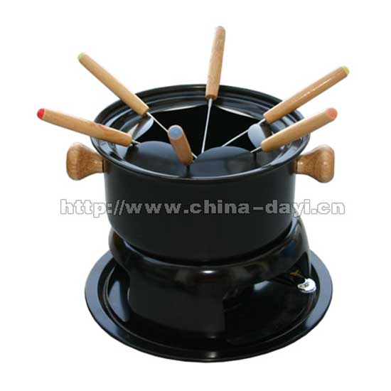 Highlighted is a fondue set designed in a mini shape. The pot is designed with holders to keep the forks in place. This fondue set is great for serving on dining table or outside in camps.