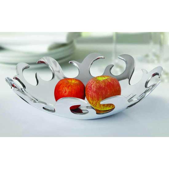 The silvery container is characterized by its corrugated edge and burnished body. It is intended to hold food, fruits or other things. With a unique appearance, this piece can also enrich your table decors.
