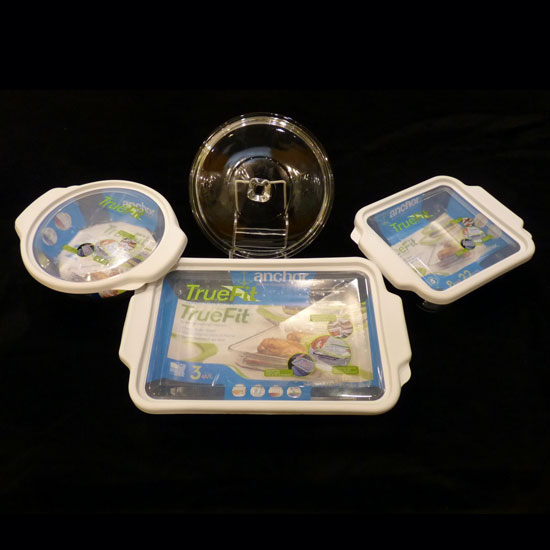 Shown here is a series of food containers designed for kitchen use. The containers feature flexible and easy-to-open lids. The lids can be exchanged for convenient applications.