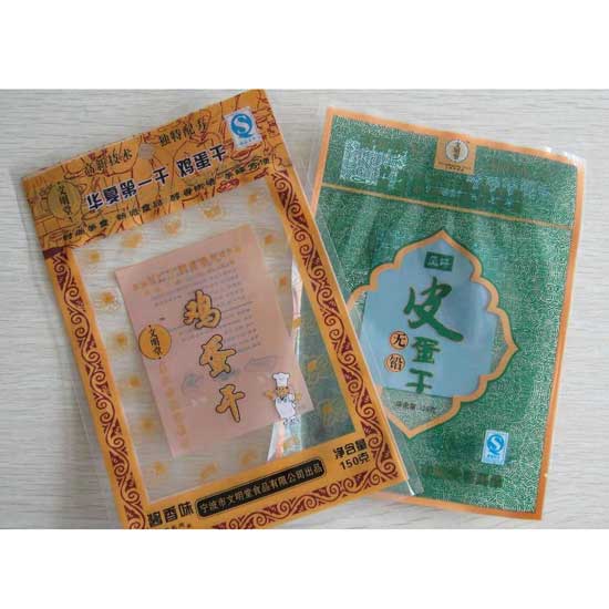 Shown here are plastic packaging bags for processed food. The bags come with color prints to suit the image of products and brands. The front is designed with a clear window to display the food.