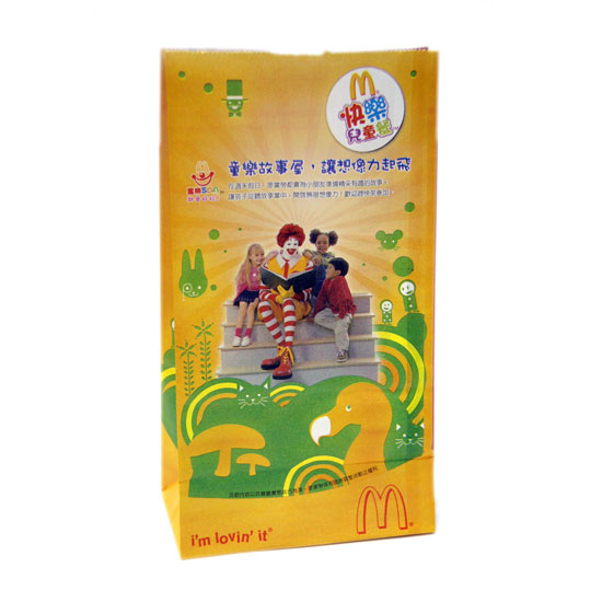 This paper bag comes in a rectangular shape in vivid yellow. The exterior is skillfully designed with smiling McDonald, lovely children and colorful patterns, conveying a sense of playfulness. This beautiful paper bag is ideal for packing takeout food.