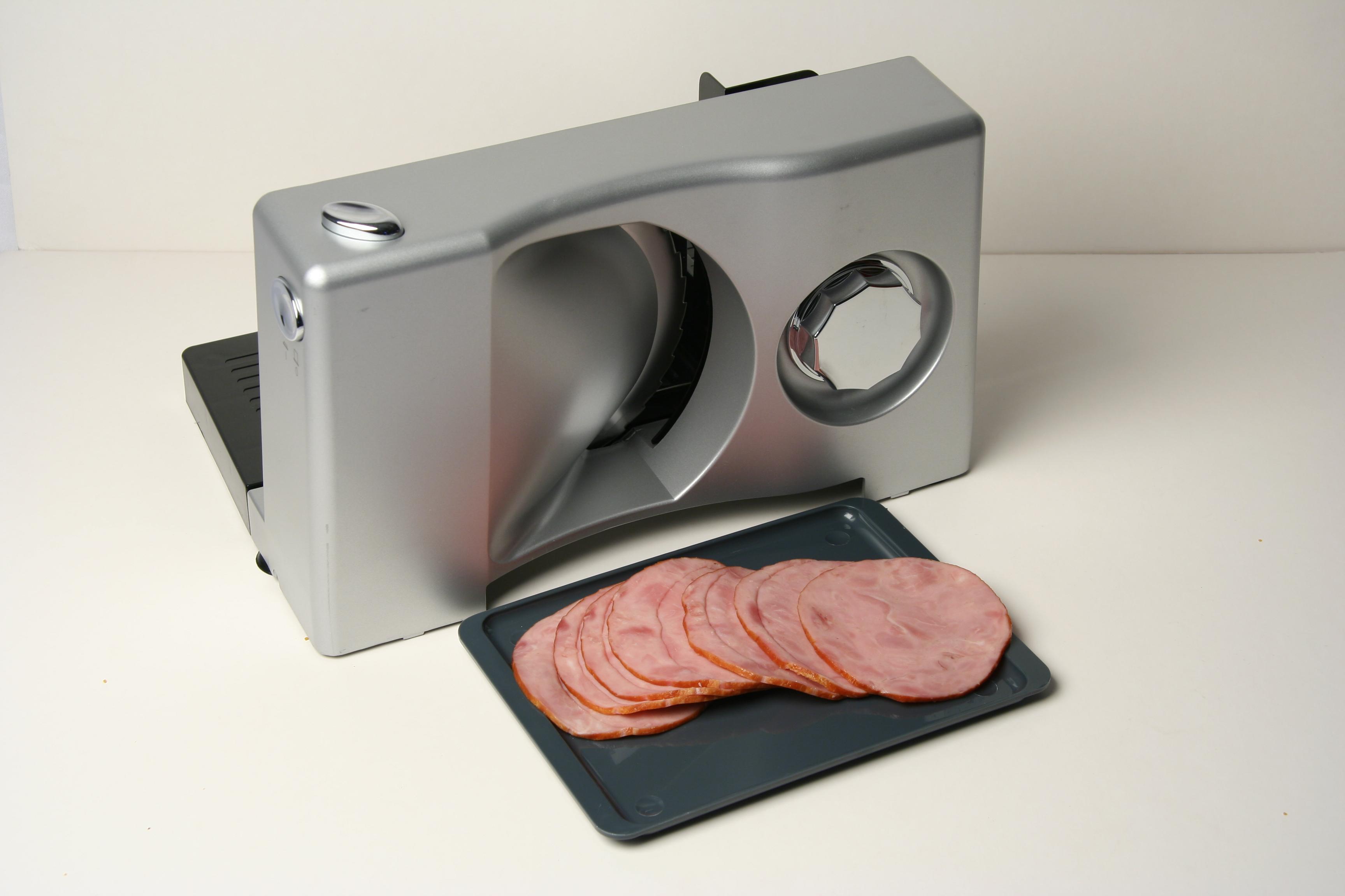 Stainless wrapping on food contacting parts Silver sprayed body Chrome plated knob and switches Chinese blade (Diameter = 170mm) 0-15mm thickness adjustment by turning knob Double safety switch operation Foldable table for easy storage Non-slip feet Cable winder underneath