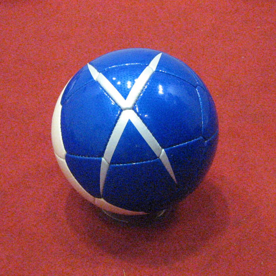 This is a football which is blue and white in colour. The football is made of rubber and is decorated with "X-shape" design.