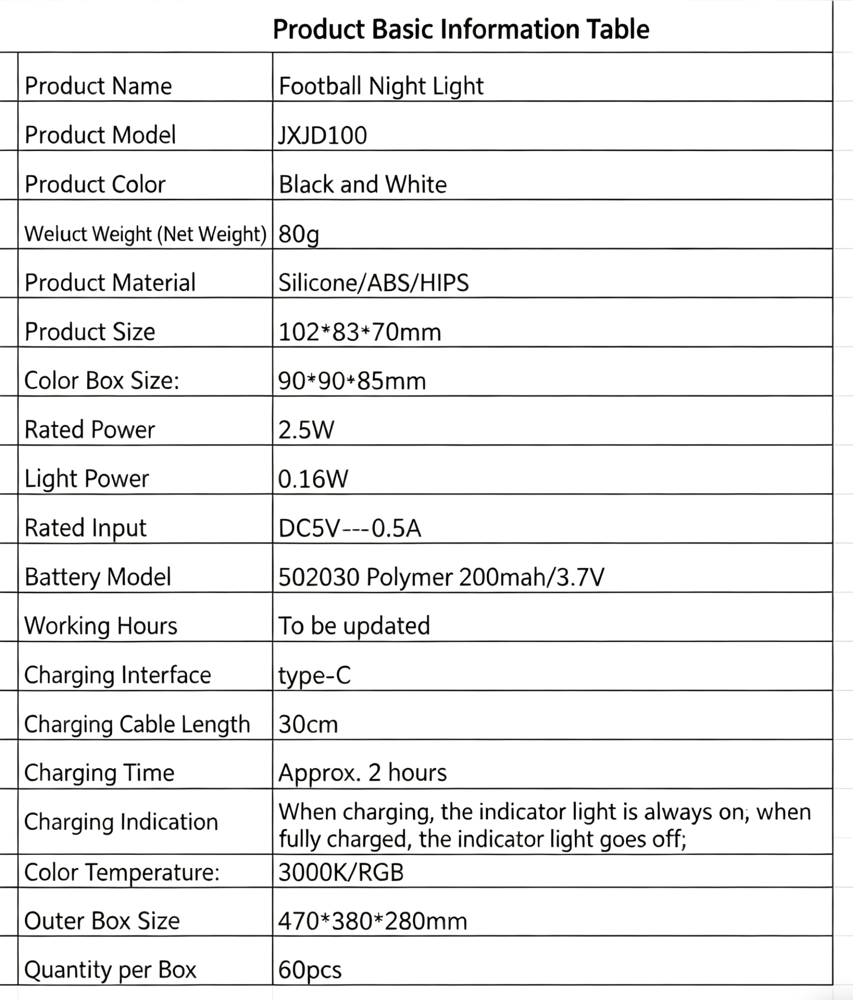 Equipped with a 502030 200mAh rechargeable battery, it charges quickly via Type-C (30cm cable) in about 2 hours. The simple one-touch control and clear charging indicator make it super easy to use. Weighing just 80g with a compact 102×83×70mm size, it’s lightweight to carry and ideal for bedrooms, study rooms, or as a cute room decoration. A great gift for sports-loving kids!