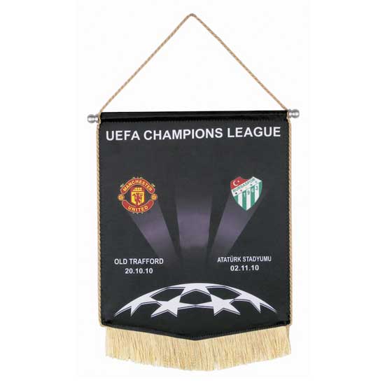 This football pennant is designed to commemorate a UEFA Championship League match between Manchester United and Bursaspor. The black pennant is finely printed with colorful logos with great details. It is accented with golden-toned tassel for added appeal.