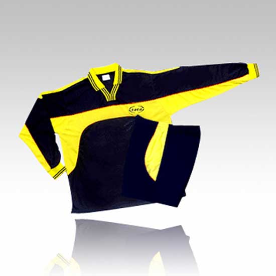 This football uniform is designed in black and golden for an eye-catching look. It comes with long sleeves and a stand collar. This football uniform is made of quality materials for a comfortable touch.