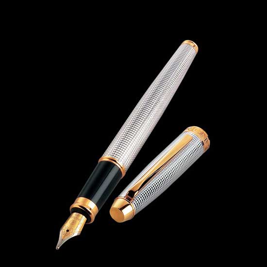 This exquisite fountain pen features an embossed metal barrel with silver-toned rhodium plating. The tip and cap is accented with 22K yellow gold for added shine. The high-quality fountain pen ensures smooth and dependable writing.