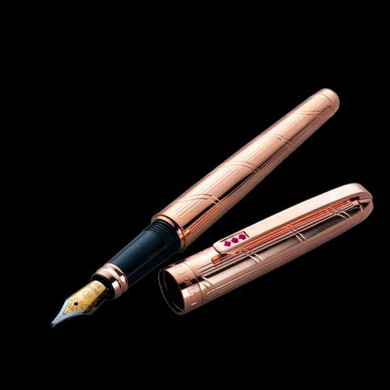 This elegant fountain pen showcases glossy rose gold plating on the barrel. The pocket clip is accented with natural ruby for added attractiveness. The quality metal tip delivers exceptionally smooth writing experience.