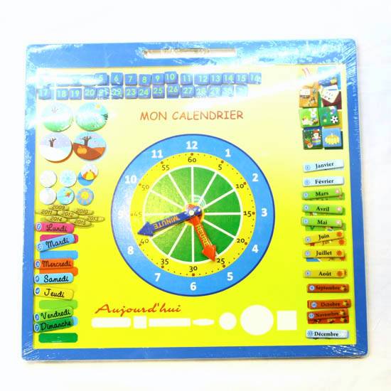 The changing calendar is in French version and it features interchangeable pieces for the month, date, season, weather and more. It comes with a clock with movable hour and minute hands. Learn basic French in a creative way with this changing calendar.