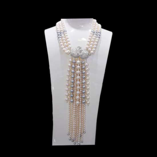 This fresh water pearl necklace features three rows of pearls on the top and multiple lines of draping pearls. The white and silver colors alternate with each other for an attention-grabbing look. This deluxe pearl necklace is ideal for grand occasions.