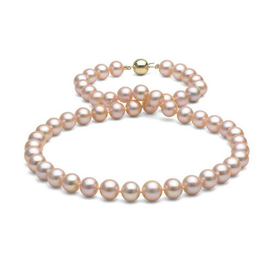 This is a fresh water pearl necklace with a fashionable design. The pearls come in a peach color for a stylish touch. This pearl necklace is great for complementing your chic look.