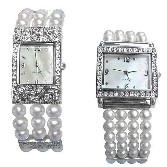 This charming wristwatch features strands of dazzling pearls on the strap. The white mother-of-pearl dial and freshwater pearls bracelet band lend a touch of femininity to the wearer. This elegant timepiece complements your outfits beautifully.