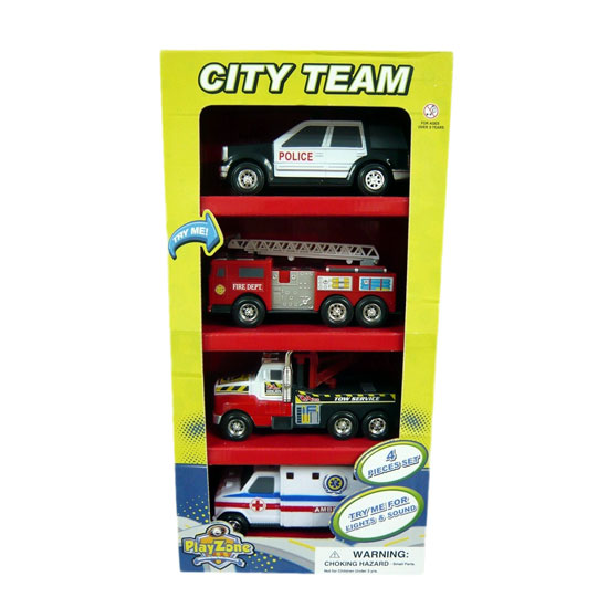 This friction car set features a police car, a fire engine, a fire truck and an ambulance. They offer realistic sound and light effects. It brings your kids hours of imaginative fun.