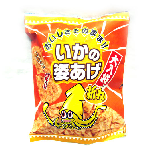 Pictured is a pack of snack prepared and made from dried and fried squid. The squid snack gives a modern Japanese flavor and a crispy texture. The saucy squid snack makes great afternoon nibbles for kids and adults.