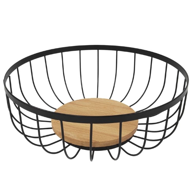 METAL & BAMBOO FRUIT BOWL - This matte black fruit bowl is made from powder coated iron, which means no rusting, scratching or peeling. The 11" octagon bamboo base is smoothly finished and coated to safely store food. Easy to hand wipe with a damp cloth.