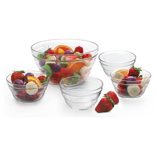 These are 5 pieces glass set designed for but not limited to holding fruit salad. The combination has 1 big salad mixing bowl and four small bowls. Suitable for immediate serving for four persons after finish mixing the salad. Besides, they are also good for preparing soup and spaghetti.