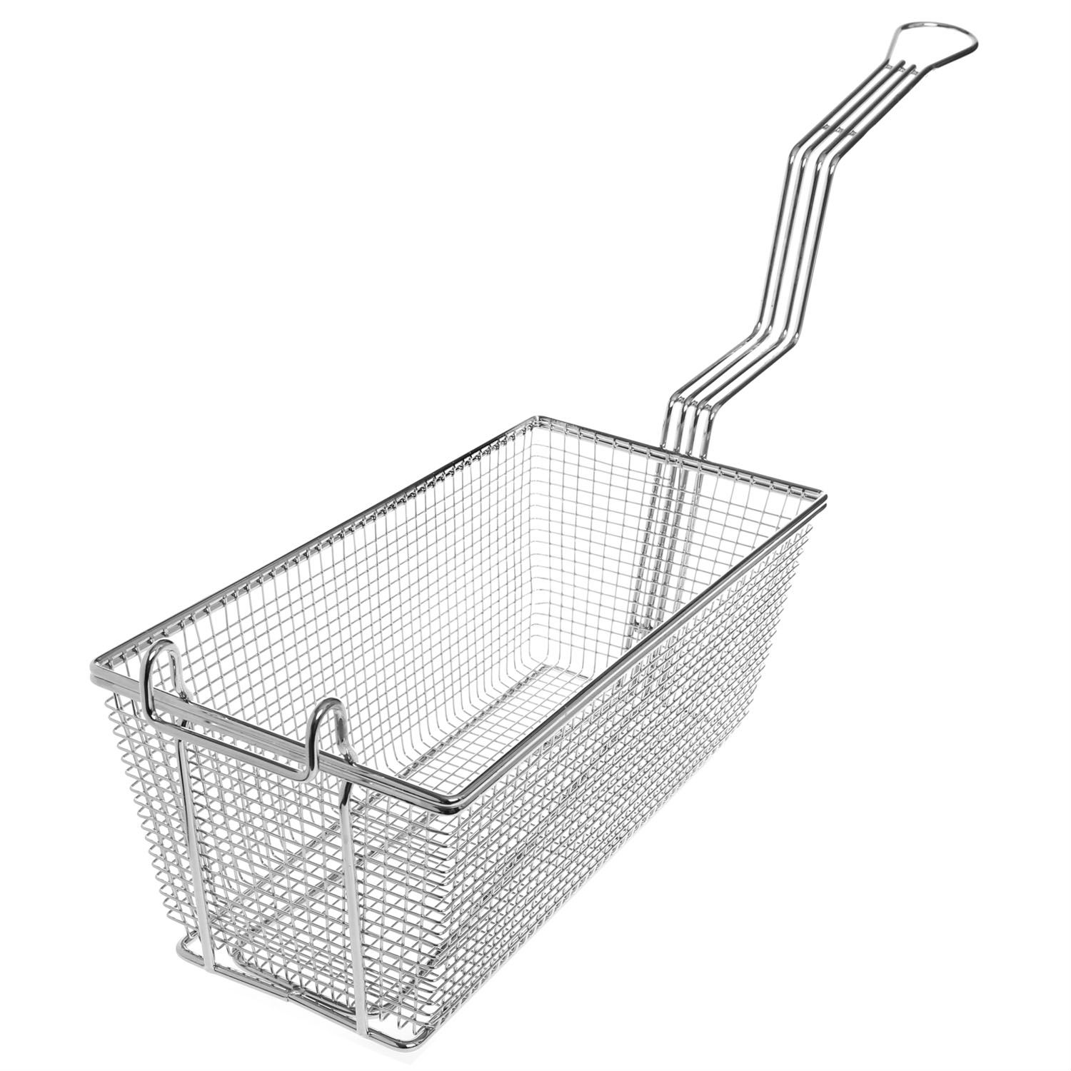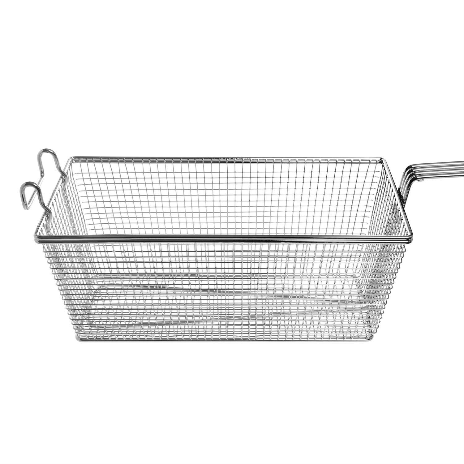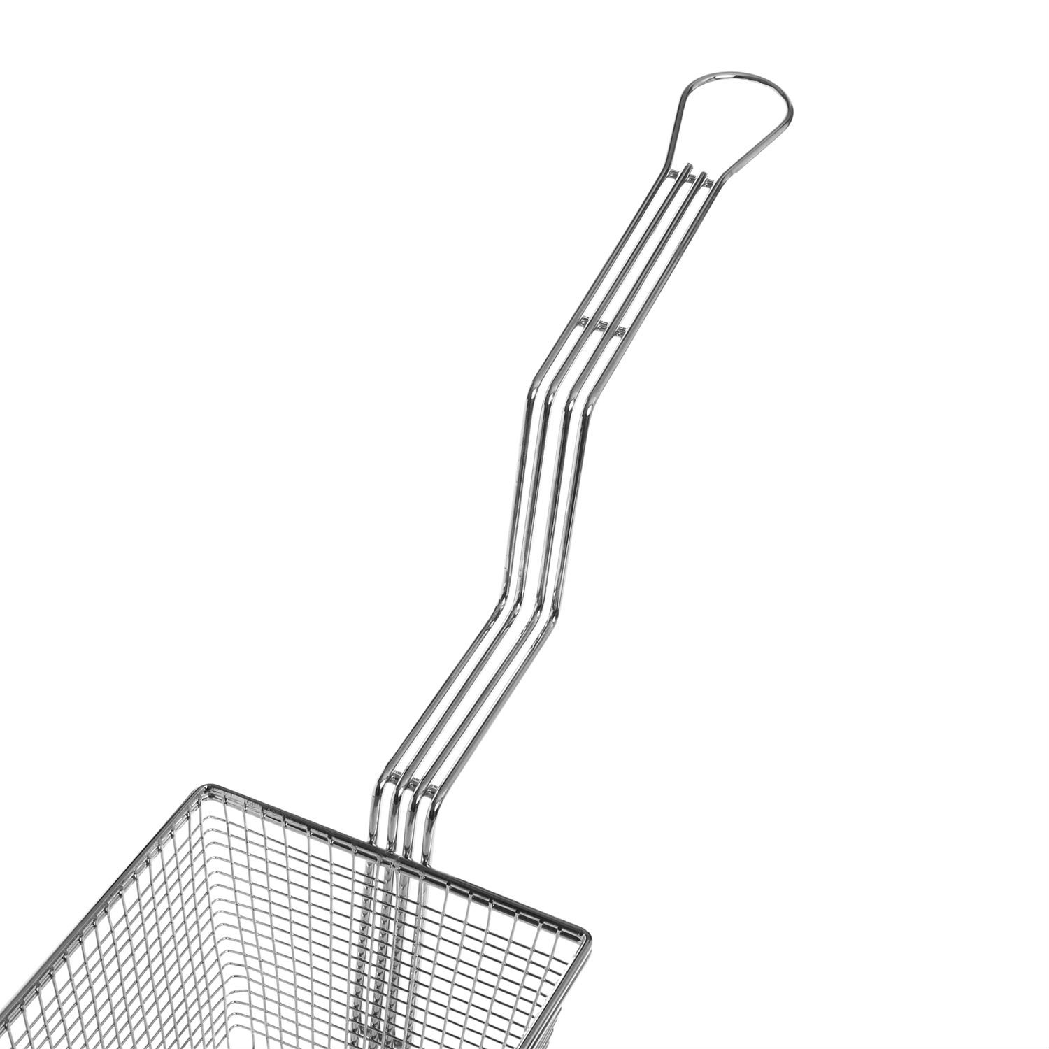 This fry basket features a sturdy nickel-plated steel wire design to stand for the demands of busy kitchens. The front hook allows you to hang the basket above the fryer for draining the surplus oil off while the elongated, double-bent handle keeps you away from the hot items with a firm grip.