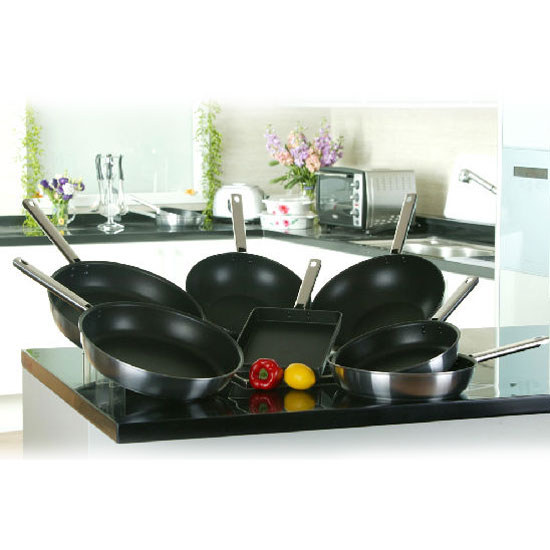 Featured here is a series of frying pans in various shapes and sizes. The high-quality frying pans are applied with non-stick Teflon coating. Crafted of durable aluminum, these durable pans can serve you for years.