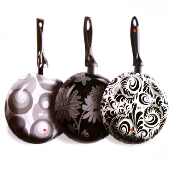 The beautiful frying pans offer a touch of fashion in the kitchen that combines usefulness with very trendy black and white designs. The heat-resistant ergonomic handles with soft-touch finishing offer a comfortable grip. Enhance your kitchen decor with any of these fashionable frying pans.