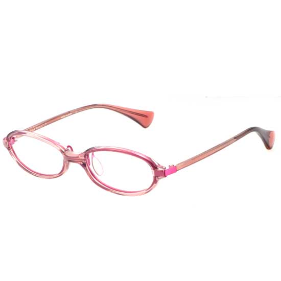 This pair of trendy eyeglasses features a full-rim design encasing oval-rectangular lenses. Both the frame and the temples boast a pink tone, while the front of the frame goes with a glossy finish and the temple in matt. The fancy design matches youthful outfits.