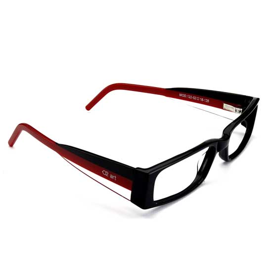 Displayed is a pair of eyeglasses with a full-rim style. Boasting large rectangular lenses, this pair of eyeglasses allows clear and broad vision. Designed with a black-tone frame with red-tone temples, this pair of eyeglasses showcases a contrasting look.
