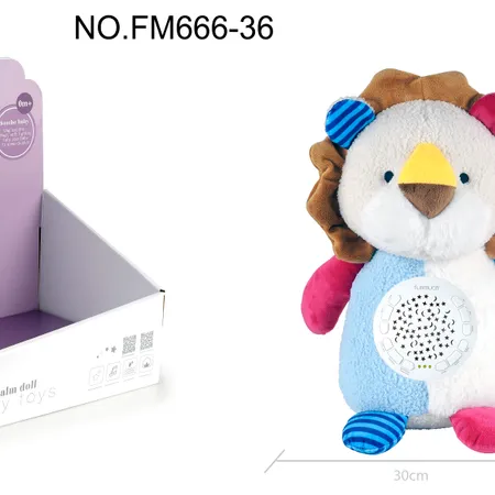 Washable, 12 keys, 6-color light with projection, 10 soothe songs, 10 lullabies, 5 white noises, 5 levels of volume, upper and lower songs can be switched, with timer. (ABS & polyester) (3*AA not included)