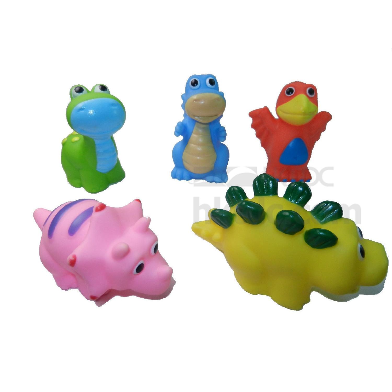 Dinosaurs are coming!  Do not worry because these plastic dinosaurs are lovely.  Each set comes with 5 dinosaurs featuring attractive appearances like round eyes, bony plates and horns.  The dinosaurs are in different color tones and they give special sound when squeezed.