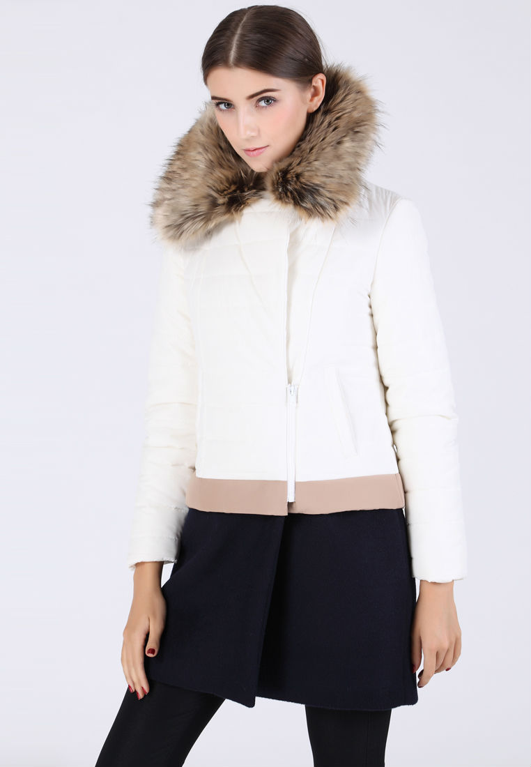 Fur Collar Quilted Coat consists of removable fur collar, quilted body, and patched with woolen fabric for the bottom part of the coat. It has two side pockets and zip fastening.