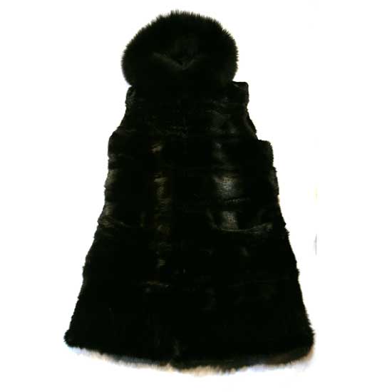 The ladies’ vest here boasts a trendy hooded design. The vest is made of genuine mink, dyed in lustrous black to show a sophisticated style. This vest brings an elegant touch to any winter looks.
