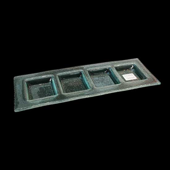 This long fused glass dish comes with four small compartments in square shapes. It can be used for placing condiments or decoration items. The modern, charming dish is a fascinating glass decoration for you.