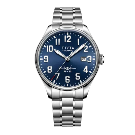 Horizon Blue, Sunburst Finish, Gradient; Numeric and Bar Hour Markers (Luminous); J-20 Line Drawing at 6 o'clock; Date Window at 3 o'clock
