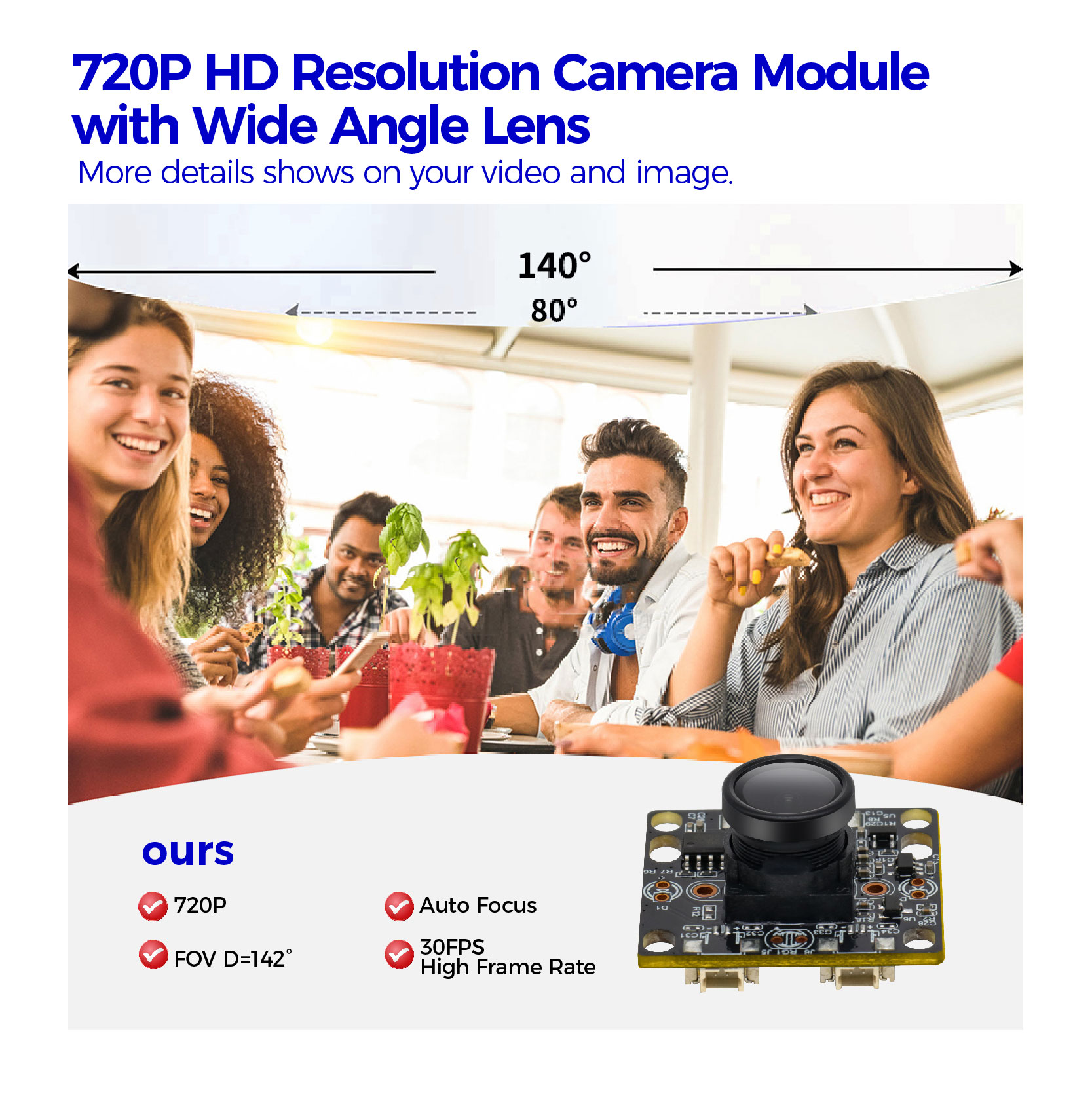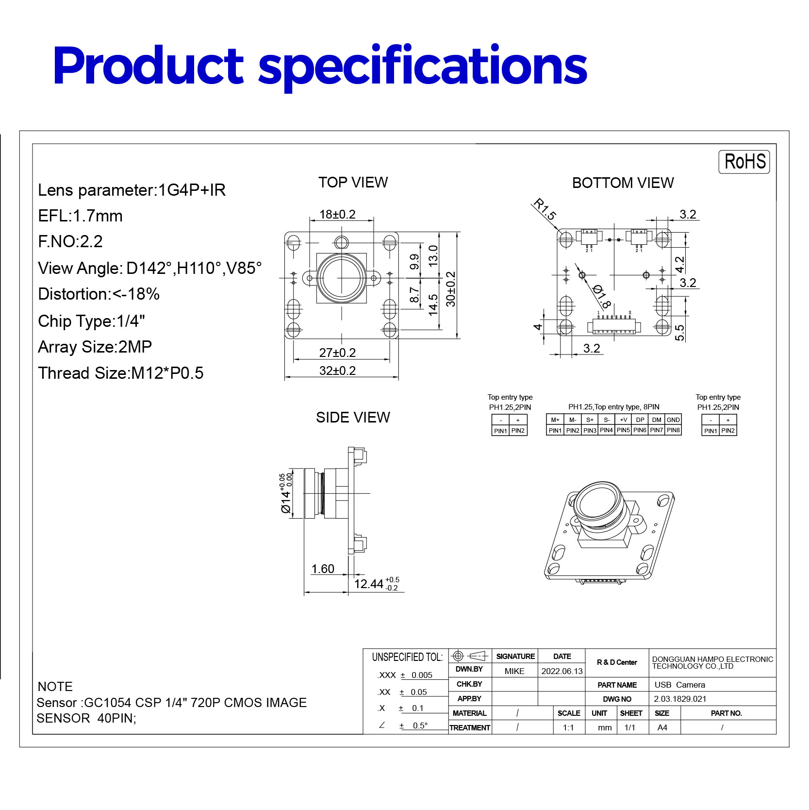 High Cost Efficient: This camera adopts the 1MP GC1054 COMS sensor, which cuts costs and gets decent image quality. Wide View of Angle: Assembled with a 142°(D) 110°(H) ultra wide angle M12 lens.