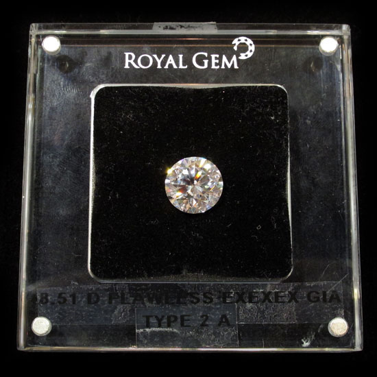 This displayed GIA diamond features a total diamond weight of 8.51 carats. The round-brilliant cut design helps reflects maximum luster and light. This round diamond will add a touch of elegance to your jewelry.