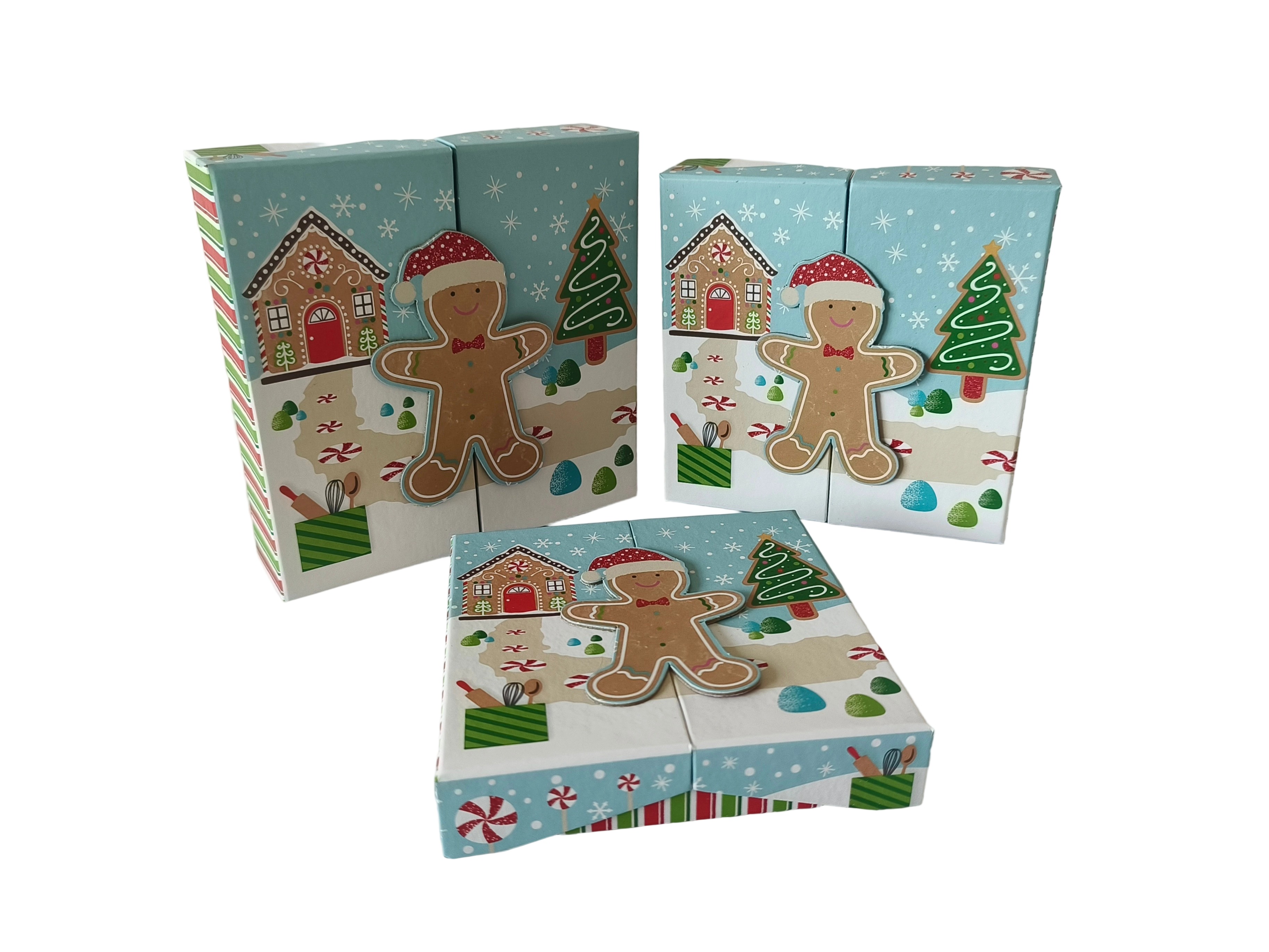 Giftbox, seasonal gift packaging, 2 door opening, handmade of recycled cardboard with character shaped and finishing.