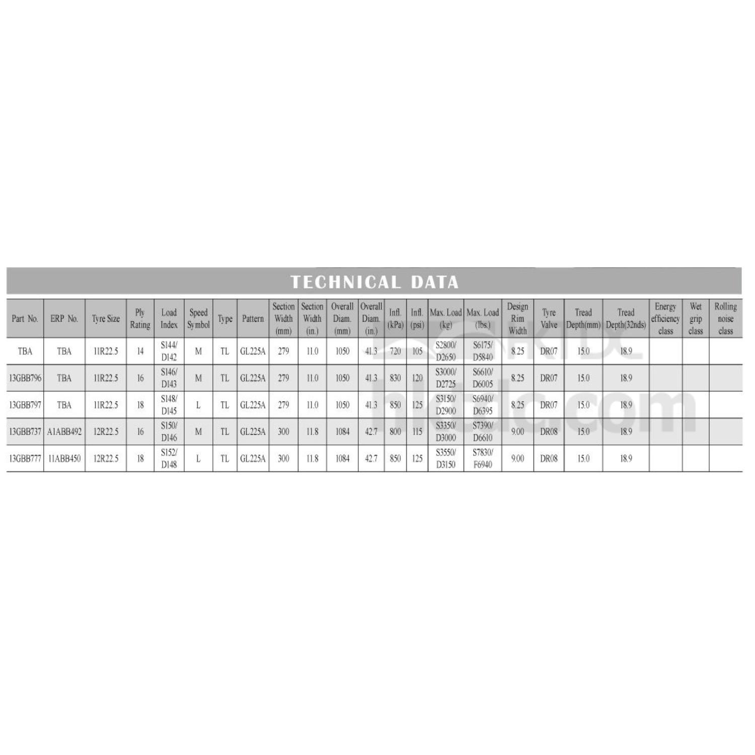 For tyre specification, please refer to the attached picture or our official website: http://www.myh.com.hk/