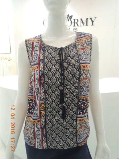 This is a digital printing sleeveless clothes with plants and national pattern, This clothes fabrics is rayon,hand feeling like cotton is soft and comfortable and glossy,is suitable for wear in summer. The front with two small edges are separated the two kinds of pattern. Flower line throughout the collar away namely decorated the clothes.