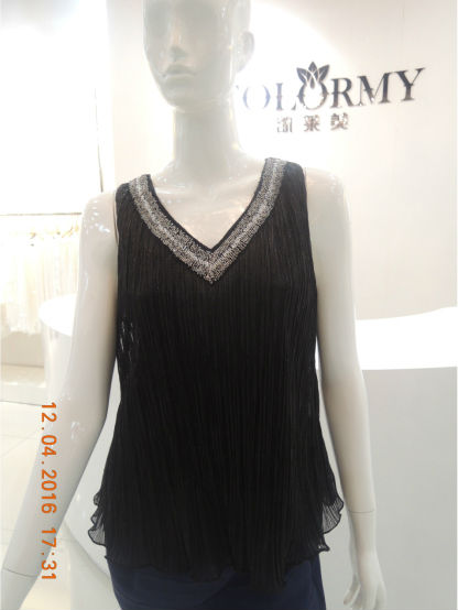 This is a V-neck sleeveless short skirt,the hem of the lotus leaf shape ,have silver beads embroider "V" along the collar edge. This fabric is a kind of the crepe mesh cloth, hand feeling is like lace very light and transparency. The skirt is suitable for wear in summer.