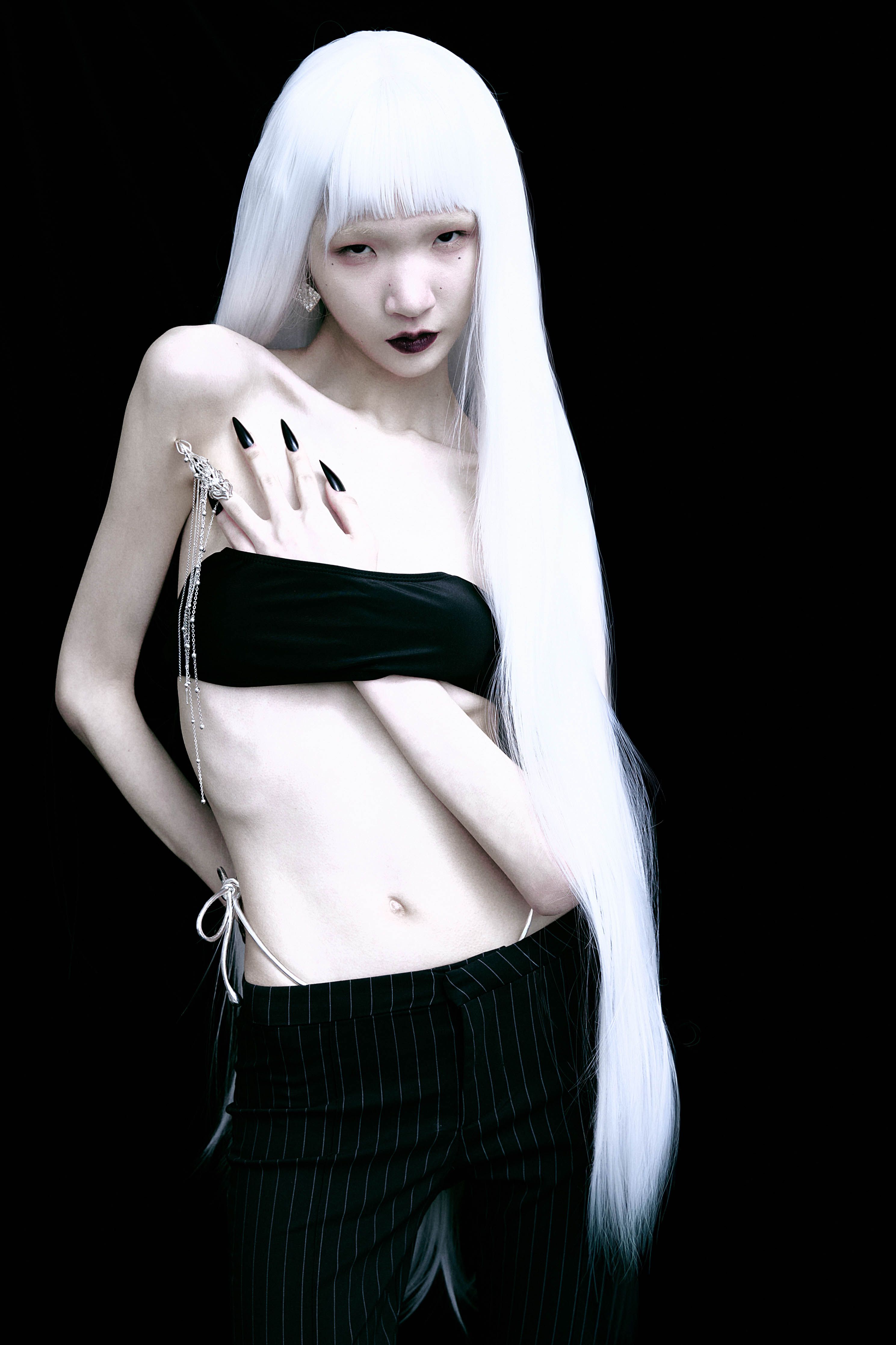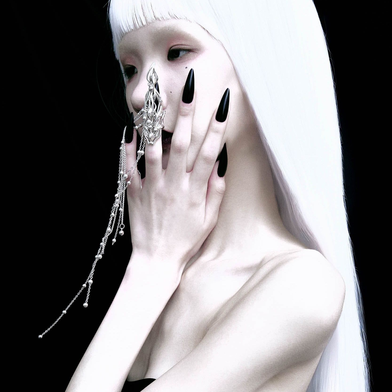 Extending from the fingertip — the body’s final point of execution — the piece embodies concentrated intent, where desire transitions into decision. Cascading chains trace the residue of movement yet to occur.