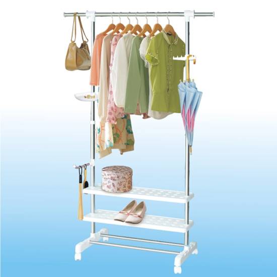 It is a practical garment rack complex that can hang garments, handbags, umbrellas and shoes altogether. The two level of racks underneath are enough for eight pairs of shoes and can be for drying clothes.