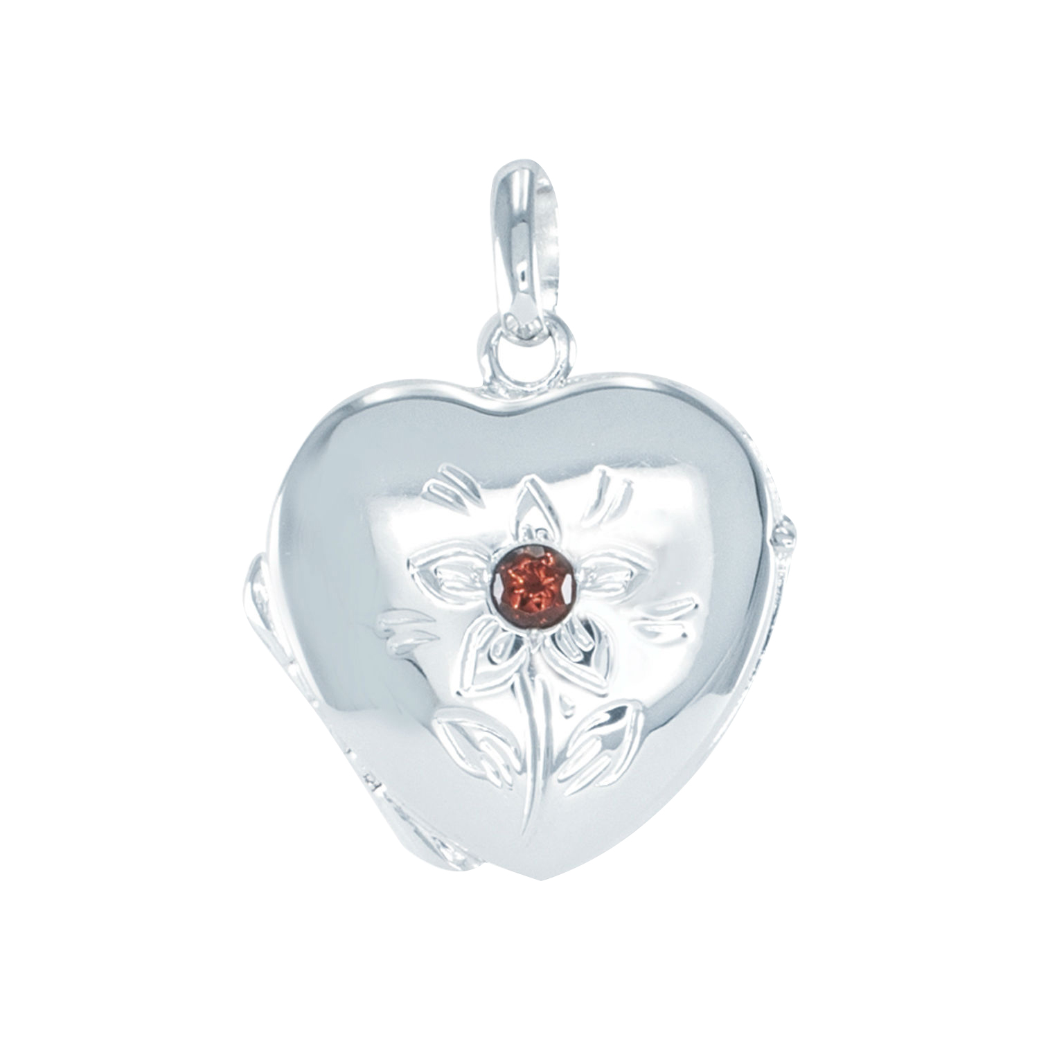 This is a locket pendant with a silvery finish. The locket pendant is engraved with a flower image on top. The mounted garnet adds a magical touch to the whole piece.