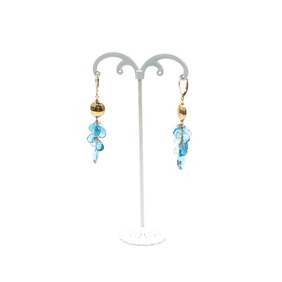 This is a pair of gem earrings mounted on 14K gold. With blue topaz dangles, these earrings are dynamic and eye-catching. These beautiful earrings are great for accessorizing evening dresses.